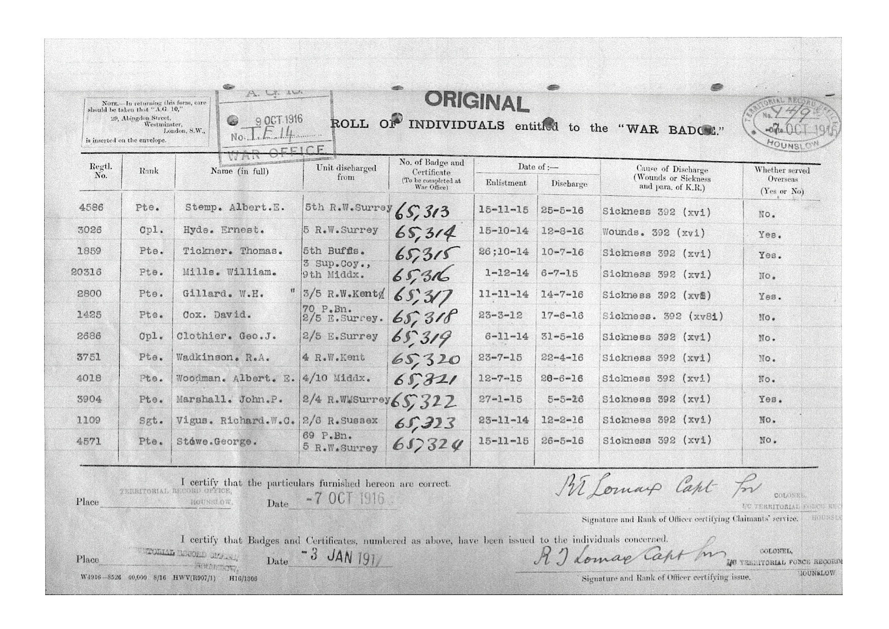 George was awarded the Silver War Badge, No. 65319 on the 3rd January 1917. These badges were issued to soldiers who had been discharged on account of age, wounds or sickness which would render them permanently unfit for further service. The badge was almost a defence against women as if a man was thought not to be in one of the services they would give him a white feather to show he was a coward. So this badge was designed for the civilians who had once been in the army but discharged. The badge meant they could not be called a coward, they would have had a reason for not being in the war. The badge was worn on the right breast whilst in civilian dress, it was forbidden to wear on a military uniform.