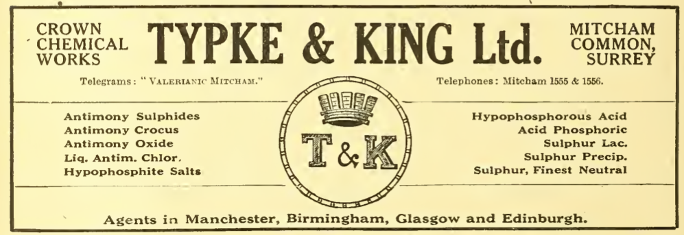 Typke & King Ltd. chemical mfrs. Crown chemical works, 295 Commonside east. T A “Valerianic, Mitcham;” T N 2136 (2 lines)