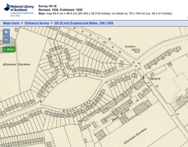 Cul-de-sac road off north side of Mount Road. The sixteen houses are numbered anti-clockwise as viewed from Mount Road, from 1 to 16. There are three pairs of semi-detached houses on the right side, numbers 1 to 6, then a terrace of four houses, numbers 7 to 10, then three pairs of semi-detached houses on the left side, numbers 11 to 16. There is a public footpath through the terrace, between numbers 8 and 9, that leads to Western Road.