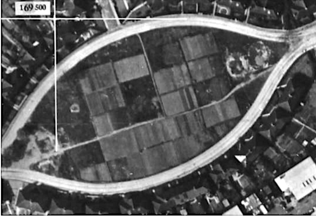 The centre part of the road split around an oval shaped green. Before being named Mount Road the road was referred to in council minutes as the Oval Road. During the second world war, this green space was converted to allotments for the war effort. This clip, from an aerial photograph by the RAF in 1946, shows the outline of the plots.