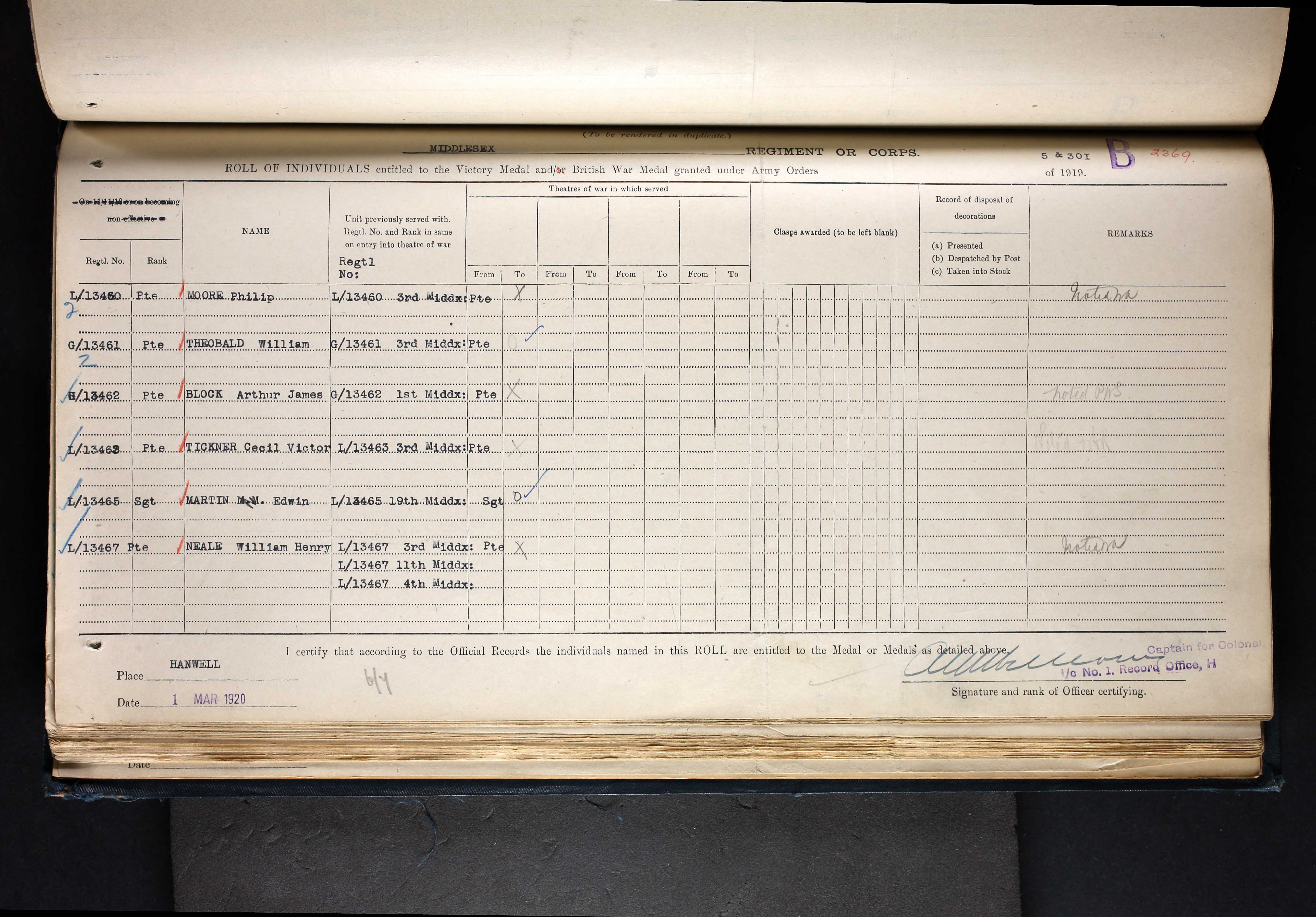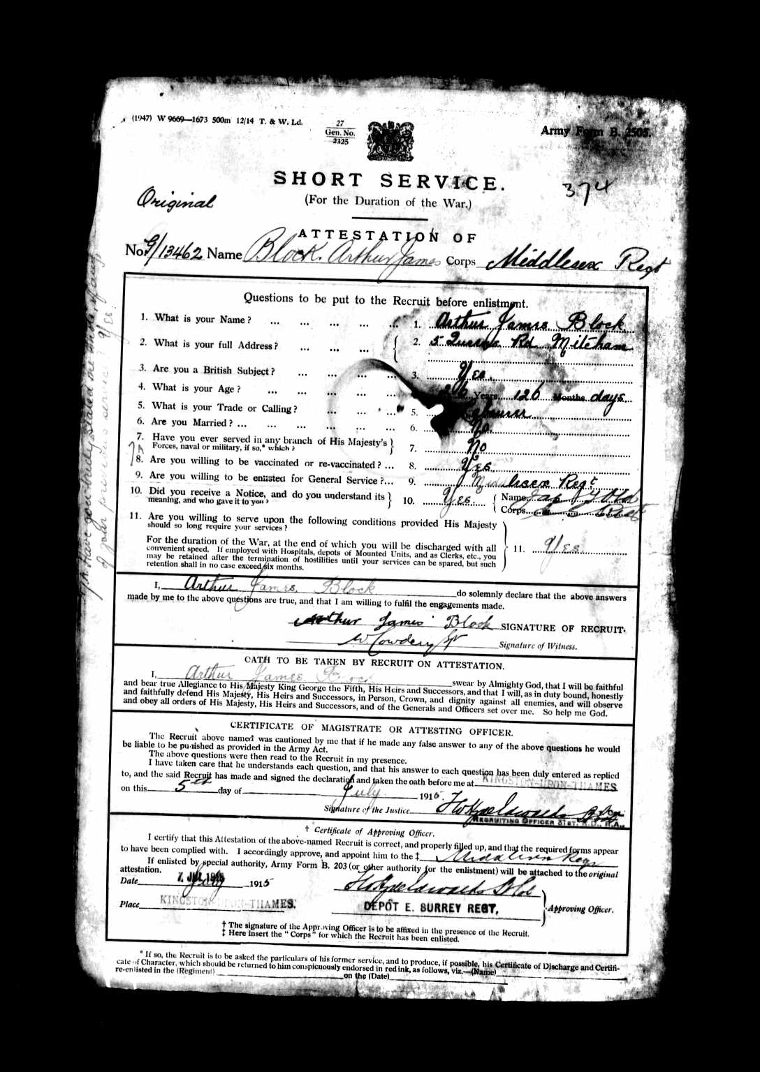 Name: Arthur James Block Birth Place: Mitcham, Surrey Death Date: 21 Aug 1916 Death Place: France and Flanders Enlistment Place: Kingston-on-thames Rank: L Corporal Regiment: Duke of Cambridge's Own (Middlesex) Regiment Battalion: 1st Battalion Regimental Number: G/13462 Type of Casualty: Died of wounds