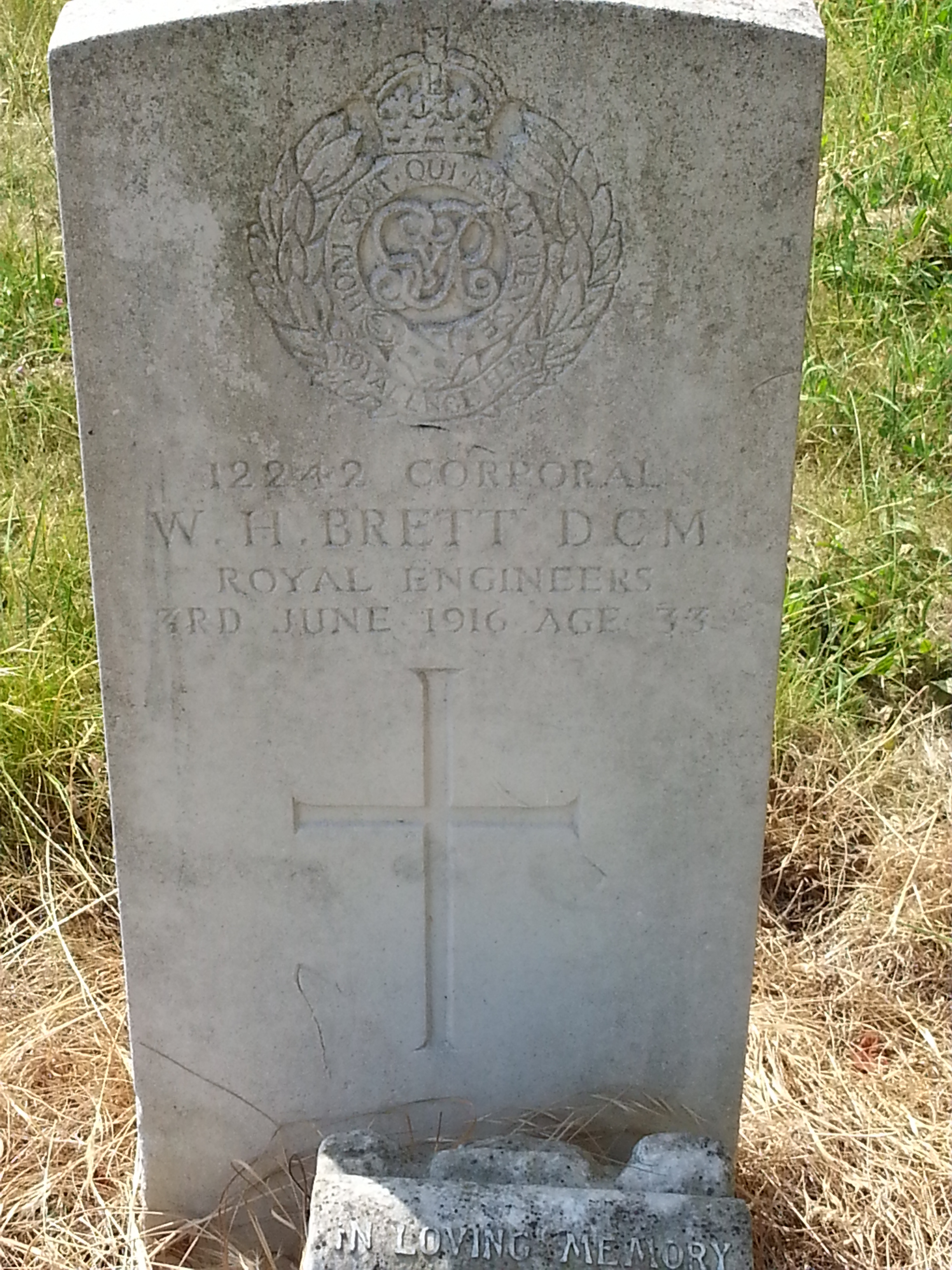 12242 Sapper W.H. Brett, 9th Fld. Co., R.E. (LG 30 June 1915). For conspicuous gallantry on the 9th April, 1915, at Givenchy, when, engaged in erecting wire entanglements in front of the trenches, after dark, he assisted in rescuing, under a heavy fire, one of the covering party who had been wounded.