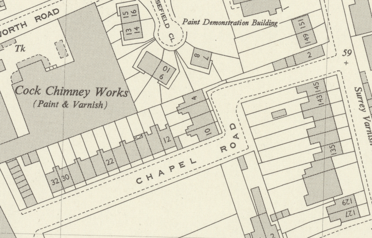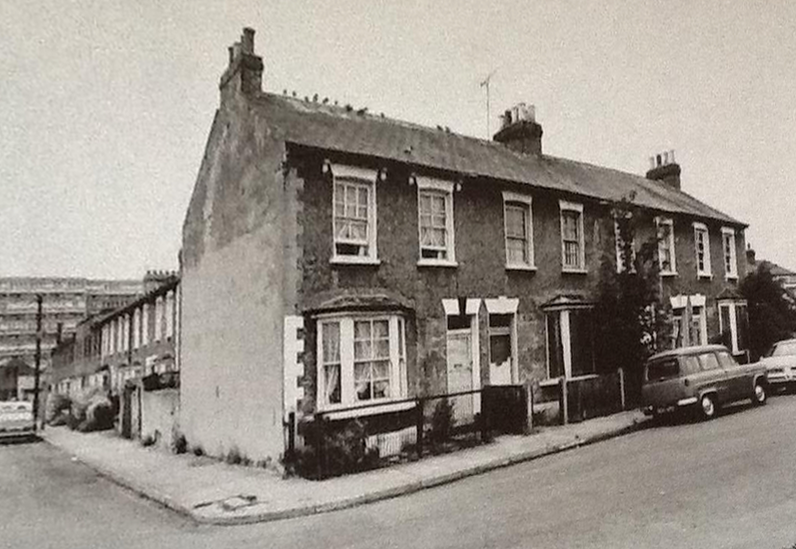 This photo is looking west, from the Church Road end, at numbers 10 on the left, 8, 6 and 4 on the right. As the new Phipps Bridge development of flats can be seen in the background, this photo is assumed to be after 1965. Note the four chimney pots for each house.