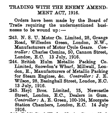 Closed down by the government under the “Trading with the Enemy Act”. An order to wind up the business was published in the London Gazette on 14th July 1916.