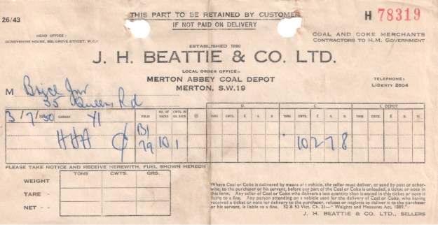 This receipt for coal in 1950 was for number 35 Queens Road which was at that time a Nissen Hut. It was for 10 hundredweights (half a ton) of HHA, which possibly meant Heavy Haulage Anthracite. The total cost was £2 7s. 8d., which in 2020 values is around £85.