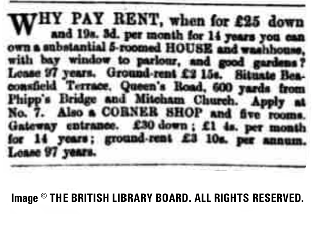 WHY PAY RENT, when for £25 down and 19s. 3d. per month for 14 years you can own a substantial 5-roomed HOUSE and washhouse, with bay window to parlour, and good gardens? Lease 97 years. Ground rent £2 15s. Situate Beaconsfield Terrace, Queen’s Road, 600 yards from Phipps Bridge and Mitcham Church. Apply at No. 7. Also CORNER SHOP and five rooms. Gateway entrance. £30 down; £1 4s. per month for 14 years; ground-rent £3 10s. per annum. Lease 97 years.