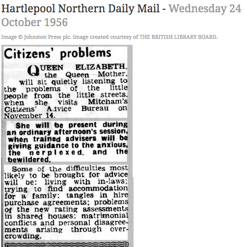 Queen Elizabeth, the late Queen Mother visited the CAB at this address on 14th November, 1956, see Merton Memories photo.