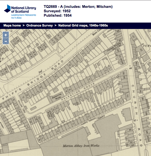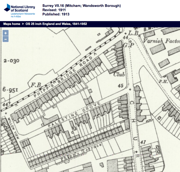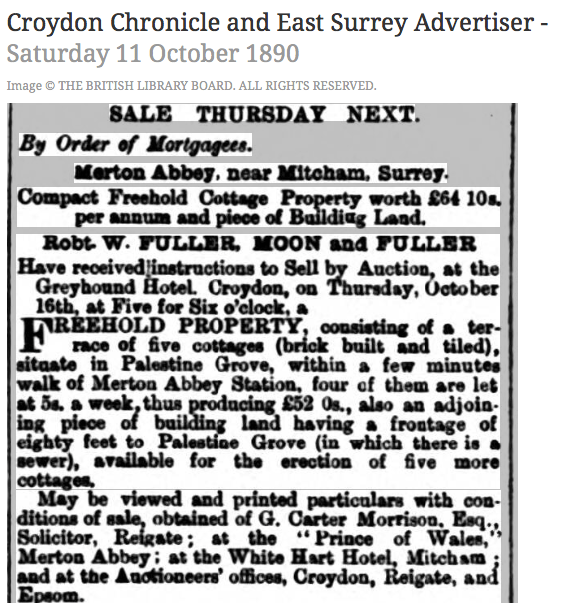 Robt FULLER, MOON and PULLER Have received instructions to Sell by Auction, at the Greyhound Hotel Croydon, on Thursday, October 16th, at Five for Six o’clock, a FREEHOLD PROPERTY, consisting of a terrace of five cottages (brick built and tiled), situate in Palestine Grove, within a few minutes walk of Merton Abbey Station, four of them are let at 5s. a week thus producing £52 0s., also an adjoining piece of building land having a frontage of eighty feet to Palestine Grove (in which there is a sewer), available for the erection of five more cottages.