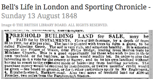 The land is planted with trees to form a grove, to be called Palestine Grove. The soil is very rich, and situation healthy. It is situated opposite the Prince of Wales, near Phips Bridge, leading from Merton Gate to Mitcham Church. This is a good opportunity for those who wish to live in their own freehold, or for builders, as houses would readily let. In order to give the labouring man a vote for the county of Surrey, and to be his own landlord without having to resort to the expensive mode of borrowing from building societies. The purchase money would be received by instalments, or twelve months’ credit would be given.