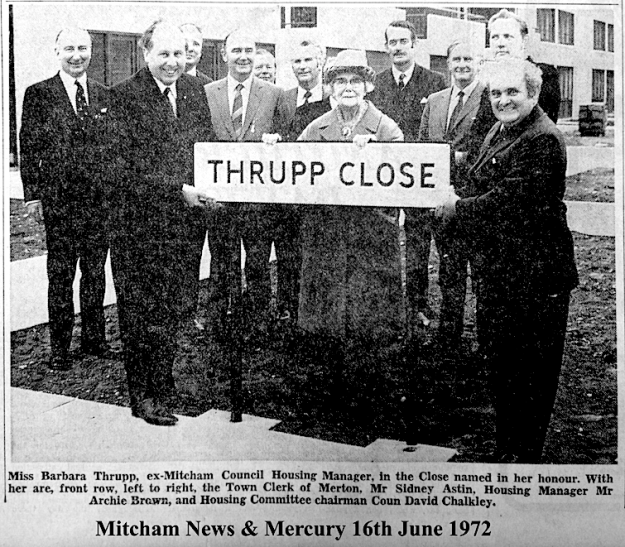 Thrupp Close Leave a reply In June 1972, this close was named after Miss B Thrupp, ex-Mitcham Council Housing Manager. 16th June 1972 Mitcham News & Mercury June 2014 Share this: Click to share on X (Opens in new window) X Click to email a link to a friend (Opens in new window) Email Click to print (Opens in new window) Print Like Loading...
