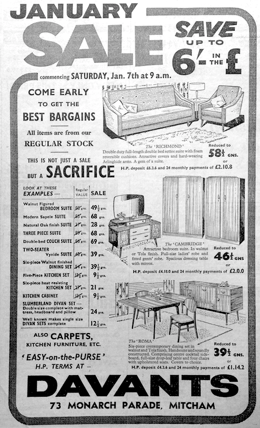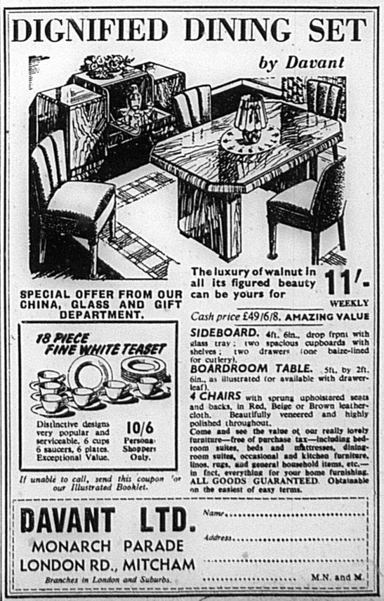 Davant Ltd Leave a reply Furniture shop at 73 Monarch Parade, seen here in this 1950 Tuck postcard: clip from 1950 Tuck postcard ad from Sept 1948 ad from The Bucks Herald of 30th April 1948 ad from Jan 1950 1961 ad Listed in the 1954 telephone book with the number MIT 4893 Share this: Click to share on X (Opens in new window) X Click to email a link to a friend (Opens in new window) Email Click to print (Opens in new window) Print Like Loading...