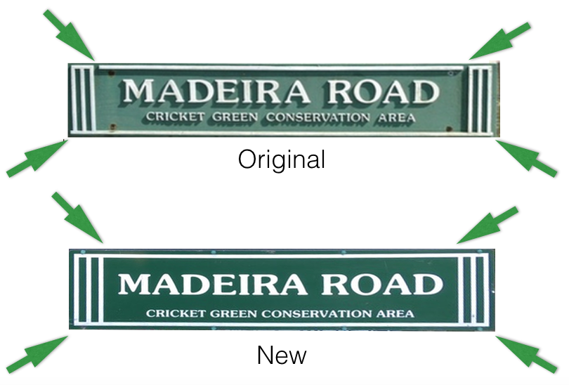 Of the remaining 42, two have been replaced with an incorrect design. By missing out the gaps between the top horizontal line and the wickets, and the extension of the lower horizontal line at the feet of the wickets, the ‘cricket pitch’ design is lost. Madeira Road and Willow Lane have these new designs.