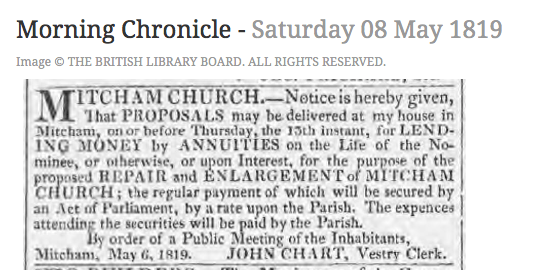 MITCHAM CHURCH-.-Notice is hereby given, That PROPOSALS may be delivered at my house in Mitcham, on or before Thursday, the 13th instant, for LENDING MONEY by ANNUITIES on the Life of the Nominee, or otherwise, or upon Interest, for the purpose of the proposed REPAIR and ENLARGEMENT of MITCHAM CHURCH; the regular payment of which will be secured by is an Act of Parliament, by a rate upon the Parish. The expences attending the securities will be paid by the Parish. By order of a Public Meeting of the Inhabitants, Mitcham, May 6, 1819. JOHN CHART, Vestry Clerk.