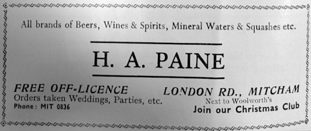 It was listed in the 1930 commercial directory as Horace Albert Paine, 250 London Road, telephone MITcham 0836. Advertised in 1954 as H.A. Paine, next to Woolworths and in 1976 as Paines of Mitcham.