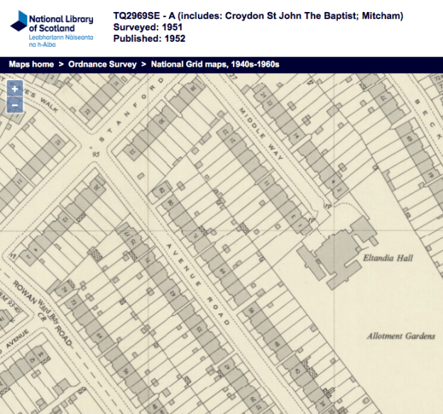 Road that is parallel, and north of, Rowan Road, running between Stanford Way at its northern end, and Northborough Road at the southern end. Although part of Streatham today, when built it was part of the Mitcham Urban District. Possibly built in 1925/6, see below.