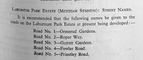 Laburnum Park was the name used for the housing development on the former Mitcham Stadium site. It may have been the name given by Wates Ltd, the developers, who bought the site in 1955.