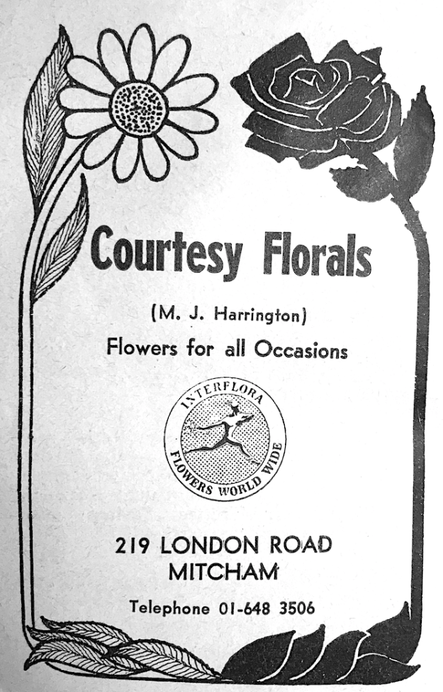 Courtesy Florals Leave a reply Flower shop that was at 219 London Road c.1987 clip from Merton Memories photo reference Mit_8_1-33, copyright London Borough of Merton 1982 ad for Courtesy Florals at no. 219 Courtesy Florals (M.J. Harrington) Flowers for all Ocassions 219 London Road Mitcham Telephone 01-648 3506 Share this: Click to share on X (Opens in new window) X Click to email a link to a friend (Opens in new window) Email Click to print (Opens in new window) Print Like Loading...