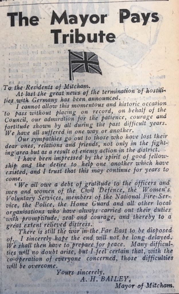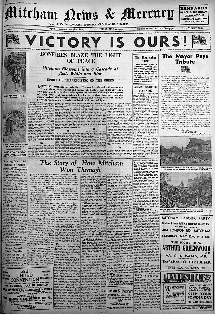 Victory Is Ours Leave a reply The front page of the Mitcham News & Mercury, 11th May 1945 Share this: Click to share on X (Opens in new window) X Click to email a link to a friend (Opens in new window) Email Click to print (Opens in new window) Print Like Loading...