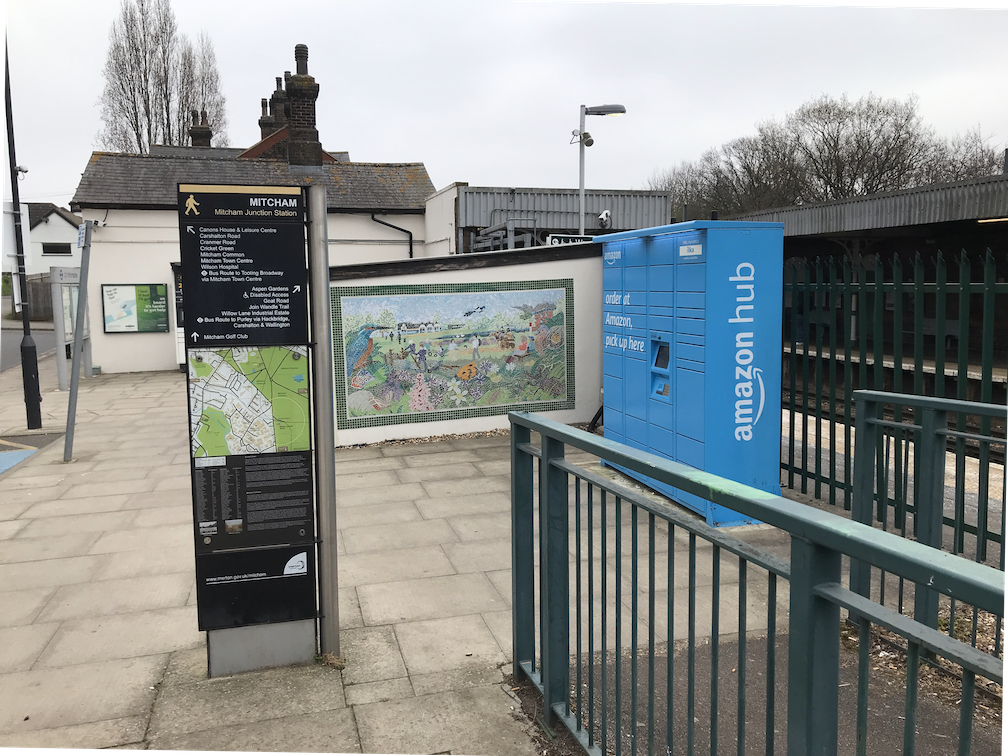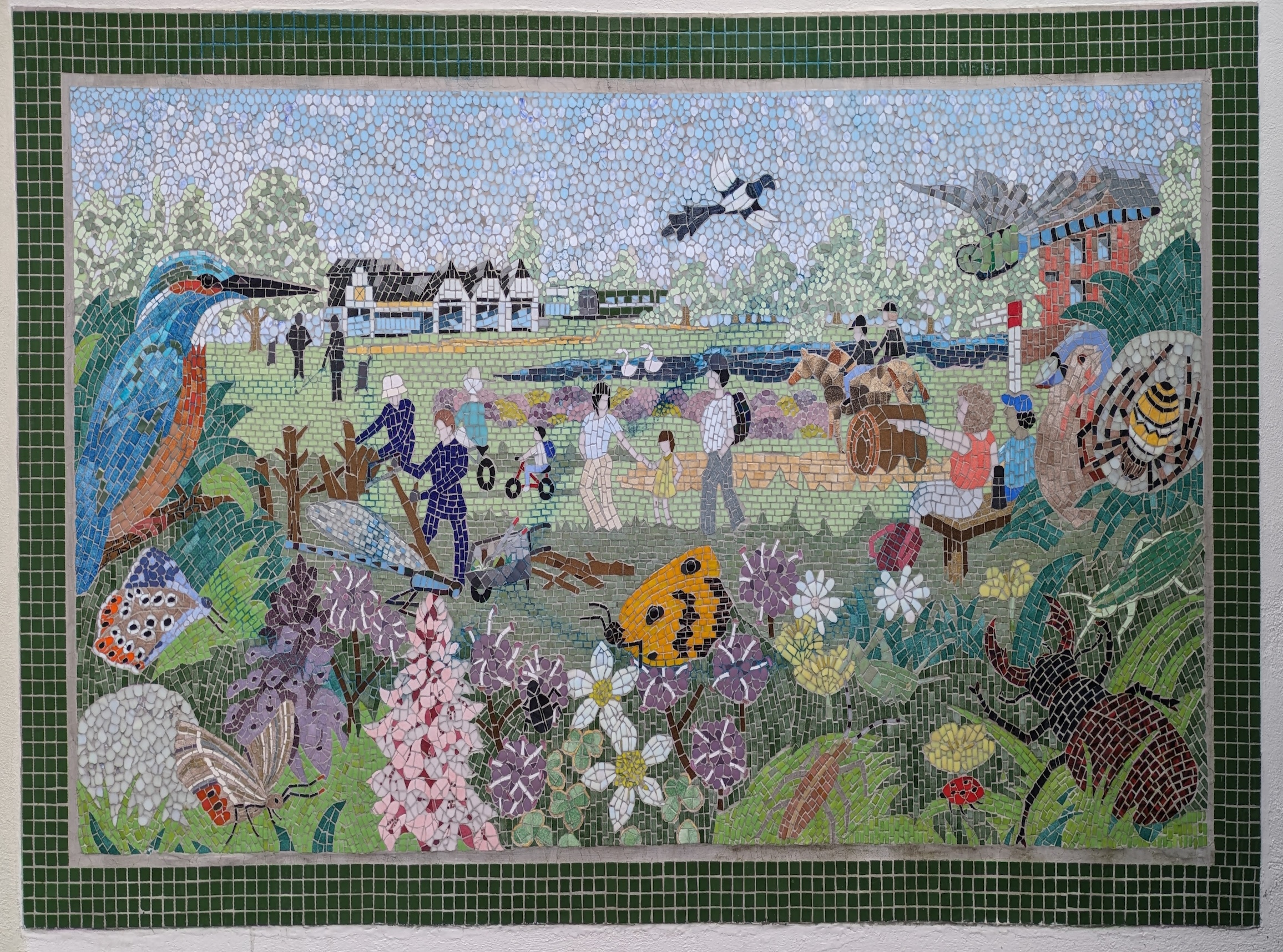 This mosaic, depicting Mitcham Common, was produced by Louise Frewin and Karen Parry. It shows the Mitcham Golf Club building, which is close to Mitcham Junction Station. The funding for this artwork was from a local developer.
