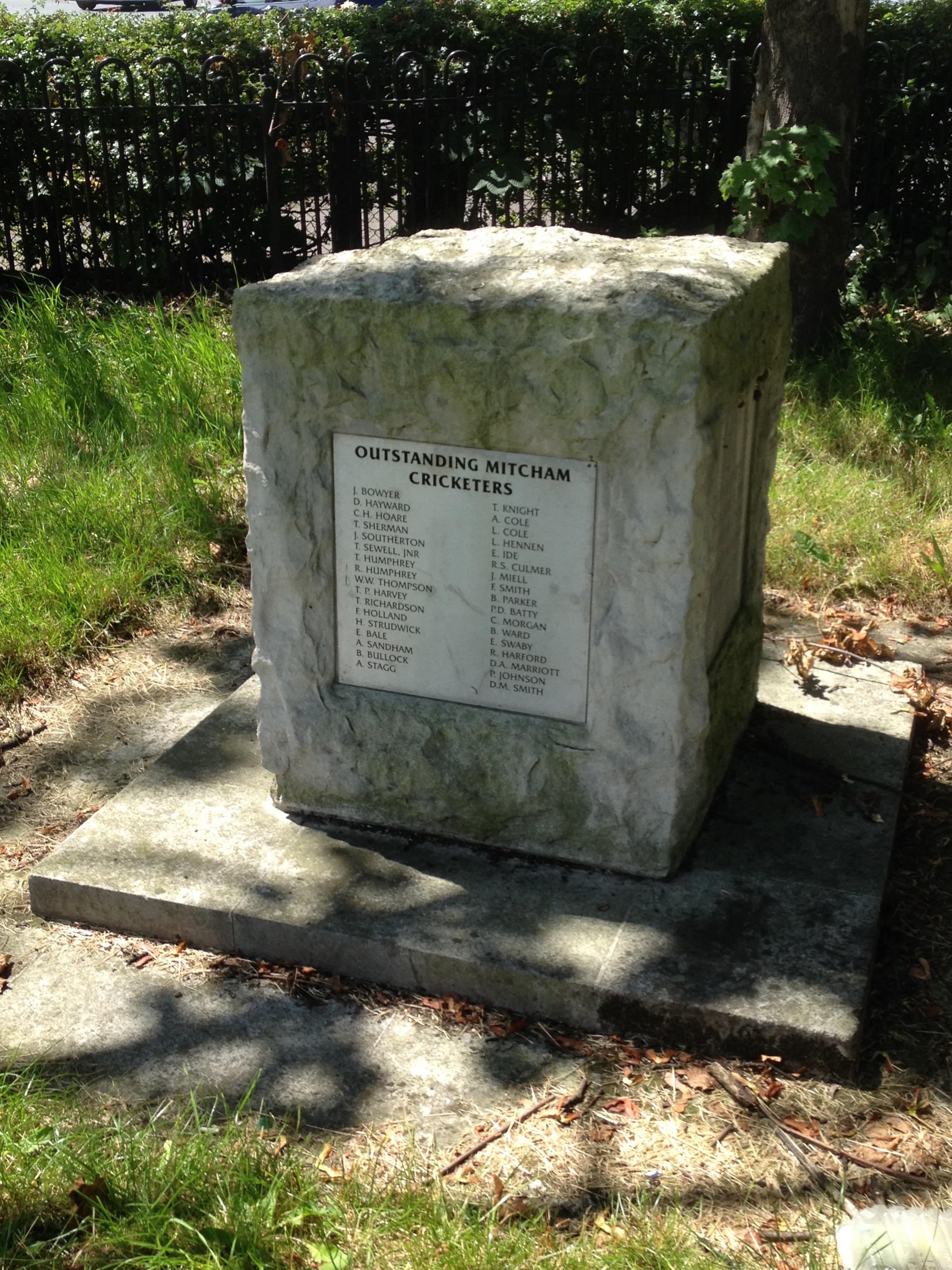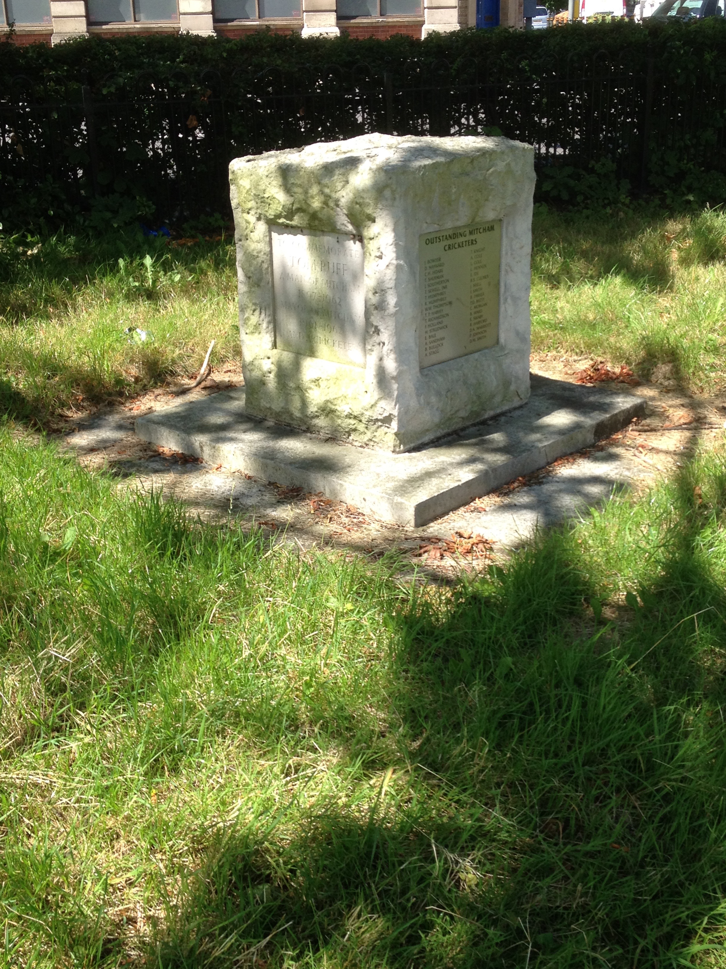 It commemorates “the birthplace of the noble game of cricket which has been played here since the early 18th century”. On one side of the stone there is a carved coat of arms of the Borough of Mitcham, on another the names of notable cricketers who played here are recorded, on a third is recorded the name of Tom Ruff (Mayor of Mitcham and cricket lover) 1897- 1962.