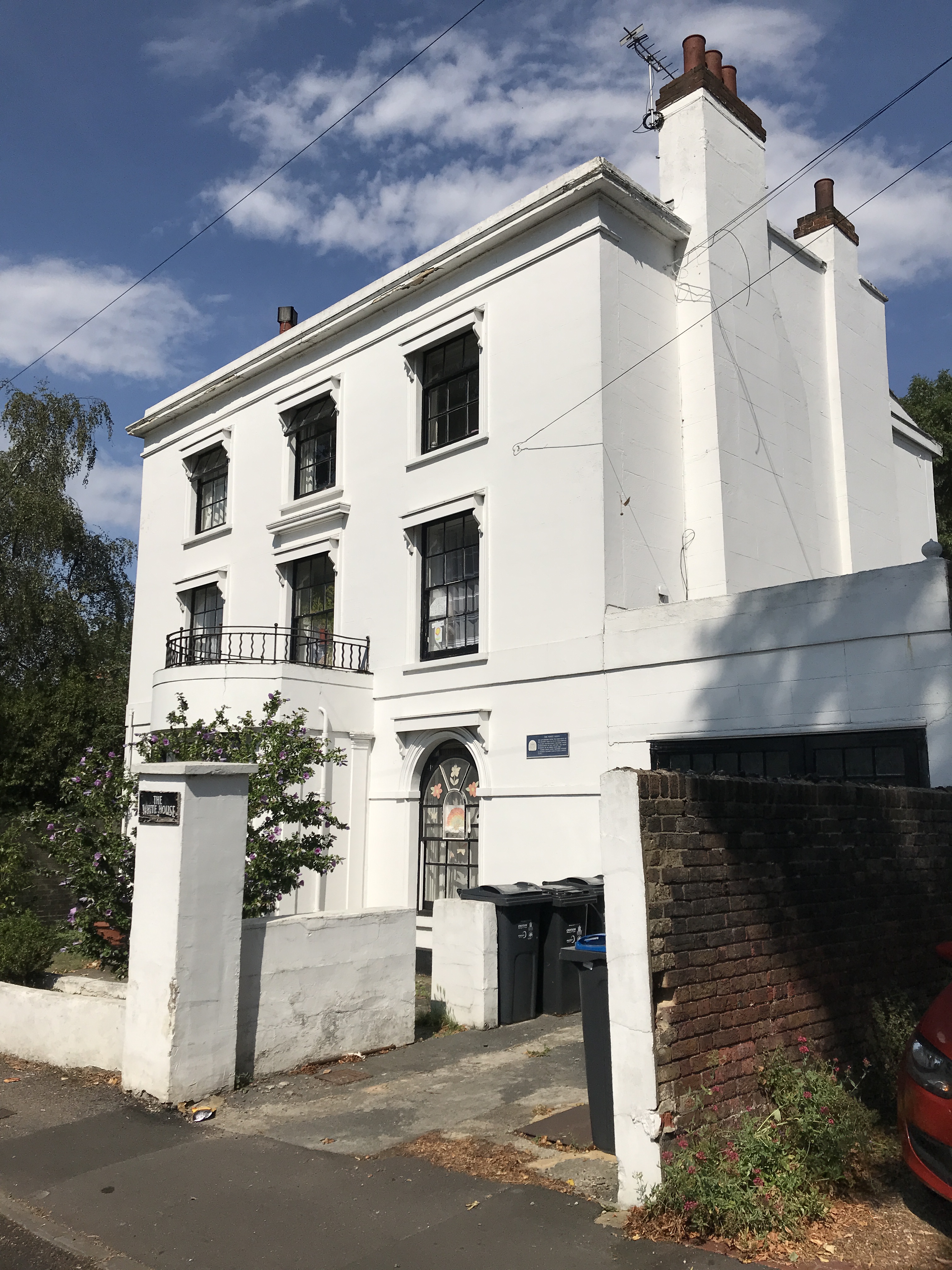 Detached house. C18 with exterior of 1826. Stucco. 3 storeys. 3 windows wide. Central bowed solid sided pilastered porch with square headed entrance and flanking Greek Doric half columns. C20 door. Architraved windows, round headed to ground floor, square headed above; corniced to first floor centre, sashes, glazing bars. Blind boxes to ground floor. Cornice above second floor. Parapet.