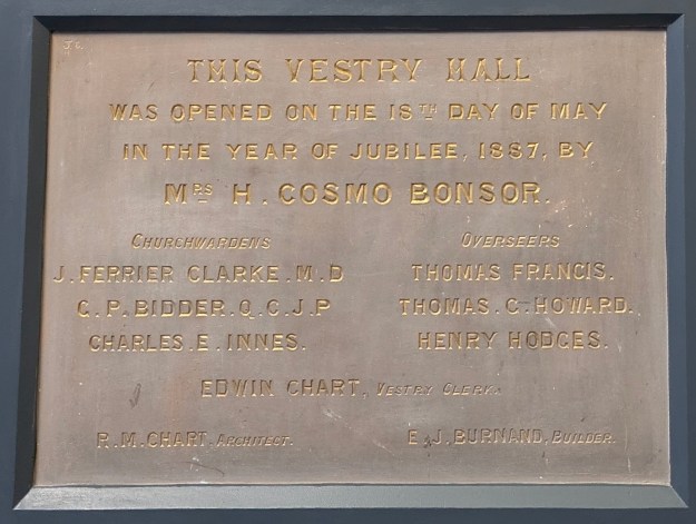 In addition to the children a very large number of the general public had assembled, and as twelve o’clock approached, Mrs. W. R. Harwood, in company with a select party of ladies and gentlemen, ascended the clock tower, and when the hour was announced, started the “Mitcham Ben”; everything, of course, in the way of winding up, &c., having been prepared before hand. This was the signal for immense cheering, on the part of the children more particularly, and the band (composed of lads from the Holborn Union Schools) struck up “God Save the Queen,” in which the children heartily joined. The children having been presented with a bun each, then dispersed or loitered about to swell the crowd that awaited the arrival of the guests invited to the opening ceremony, at 2.30. Long before that hour, however, the hall was crowded. All particulars concerning the building are given below in the statement read by Mr. Clarke, suffice it to say that the construction of the hall is such as to suit the varied requirements of those speakers, singers, and others who will have occasion to exercise their vocal powers within its walls. On Wednesday afternoon the base of the platform was handsomely set off with arum lillies, marguerites, geraniums, ferns, &c., and presented a very pleasing appearance. The vicar, the parish officers, the vestry clerk, and the local authorities assembled at the vestry clerk’s office at 2 o’clock. To await the arrival of Mrs. H. Cosmo Bonsor, who was to declare the building open. On her arrival they met her at the principal entrance to the hall where a key was presented to her. In company with Mr. H. C. Bonsor, M.P., and the Rev. D. F. Wilson, the party then proceeded upstairs to the hall amidst cheers. Arrived at the platform, Miss Blenke, daughter of Dr. Clarke, presented Mrs. Bonsor with a magnificent bouquet, which was gracefully received. On the platform or immediately around it at this time, we noticed Messrs. C. E. Innes and Dr. Clarke (churchwardens), J. Nobes (chairman of the Lighting Inspectors), J. B. Nicholls (chairman of the Highway Board), H. Hodges, F. Francis, and F. G. Howard (overseers), Rev. I. F. Wilson, Dr. W. Smith, Rev. — Seddon (Baptist Minister), Rev. F. S. Legg (vicar of Christ Church), Messrs. O. W. Berry (guardian), J. Knight (vice-chairman of the Burial Board), W. R. Harwood, J. C. Rutter, R. M. Chart, C. Robinson, S. W. Reading, J. Somerfield, H. List, and Dr. Marshall.