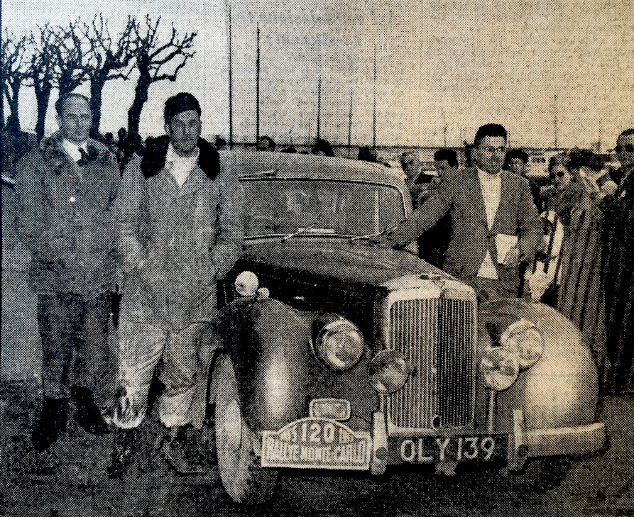 Three local men who took part in the 1955 Monte Carlo Rally stand beside their car after completing the journey. On the right is Mr. Colin Sproxton, on the left Mr. A. G. Gray and Mr. Derek Roberts.