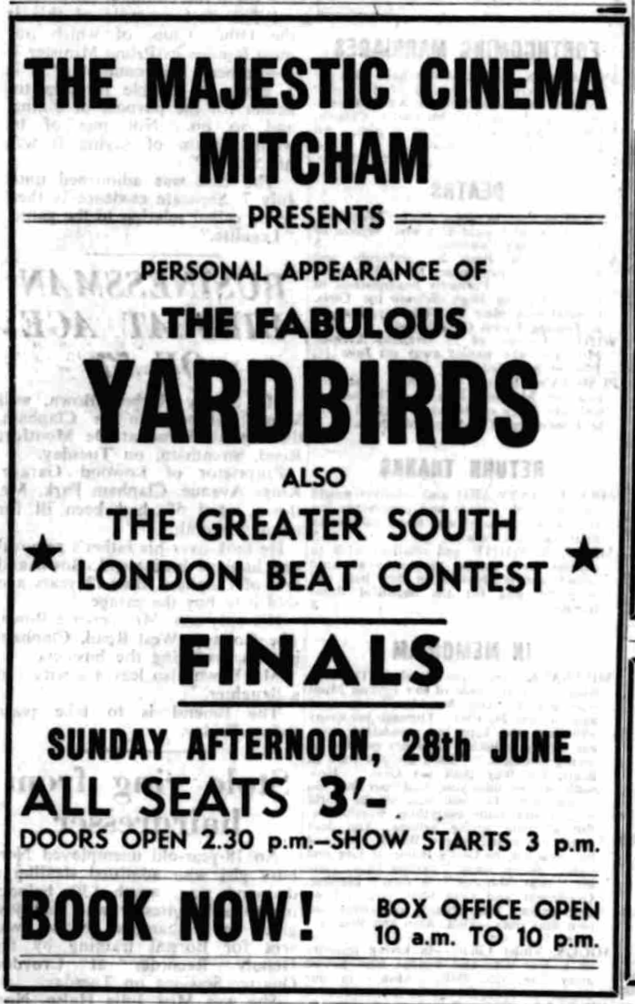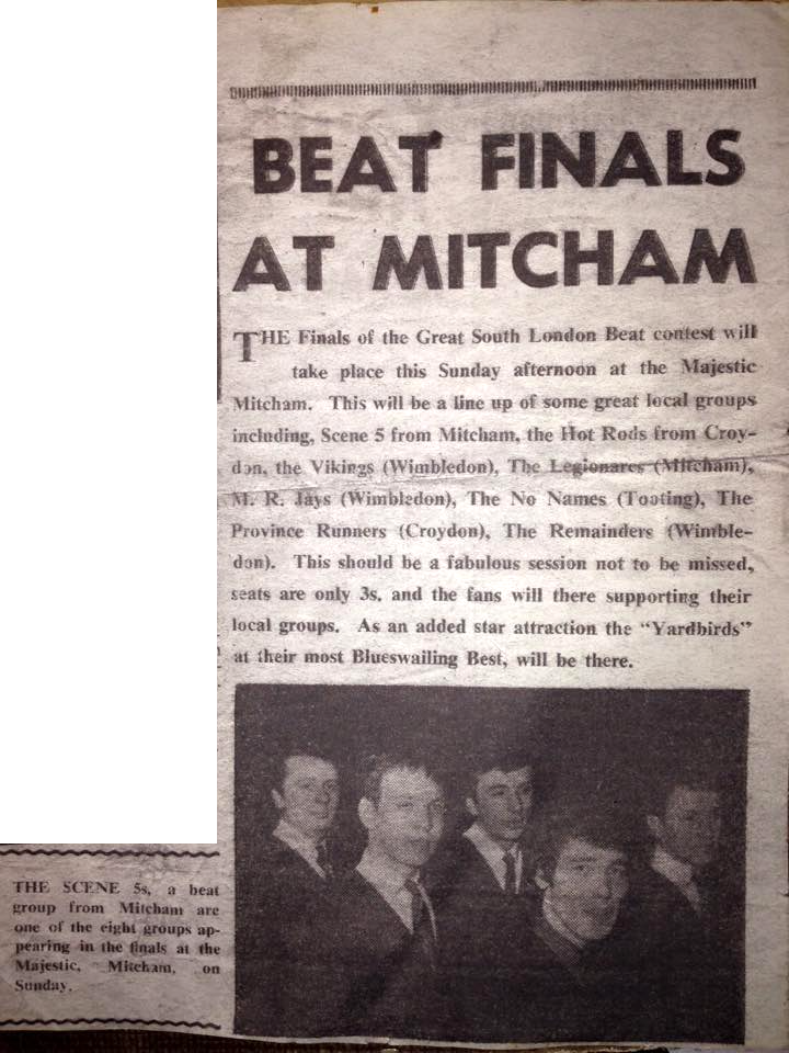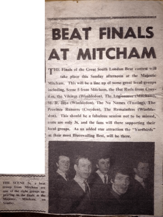 The Finals of the Great South London Beat contest will take place this Sunday afternoon at the Majestic Mitcham. This will be a line up of some great local groups including, Scene 5 from Mitcham, the Hot Rods from Croydon, the Vikings (Wimbledon), The Legionares (Mitcham), M. R. Jays (Wimbledon), The No Names (Tooting), The Province Runners (Croydon), The Remainders (Wimble-don). This should be a fabulous session not to be missed, seats are only 3s. and the fans will be there supporting their local groups. As an added star attraction the “Yardbirds” at their most Blueswailing Best, will be there.