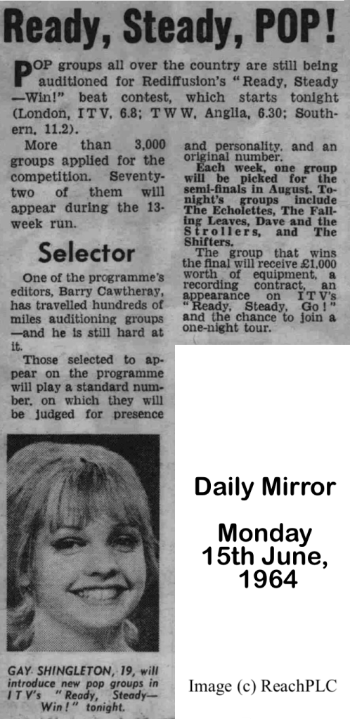“Ready, Steady, Win!” was shown on Monday evenings, just after the 6pm news, and ran over three months from June to August. Each programme had 6 bands, the winner of each being placed in the semi-finals. The first programme featured The Echolettes, The Falling Leaves, Dave and the strollers, and The Shifters.