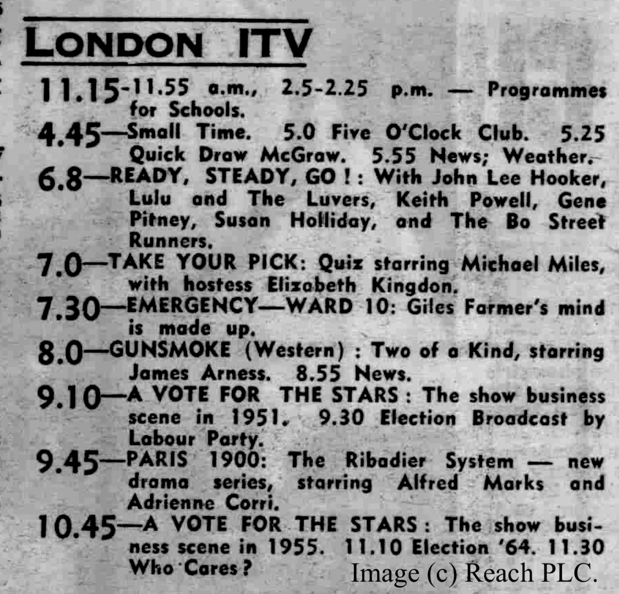 The final winner was The Bo Street Runners. They appeared on the “Ready, Steady, Go!” show on Friday 2nd October 1964, as shown in this television listing from the Daily Mirror.