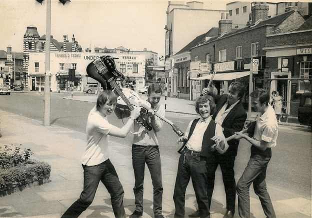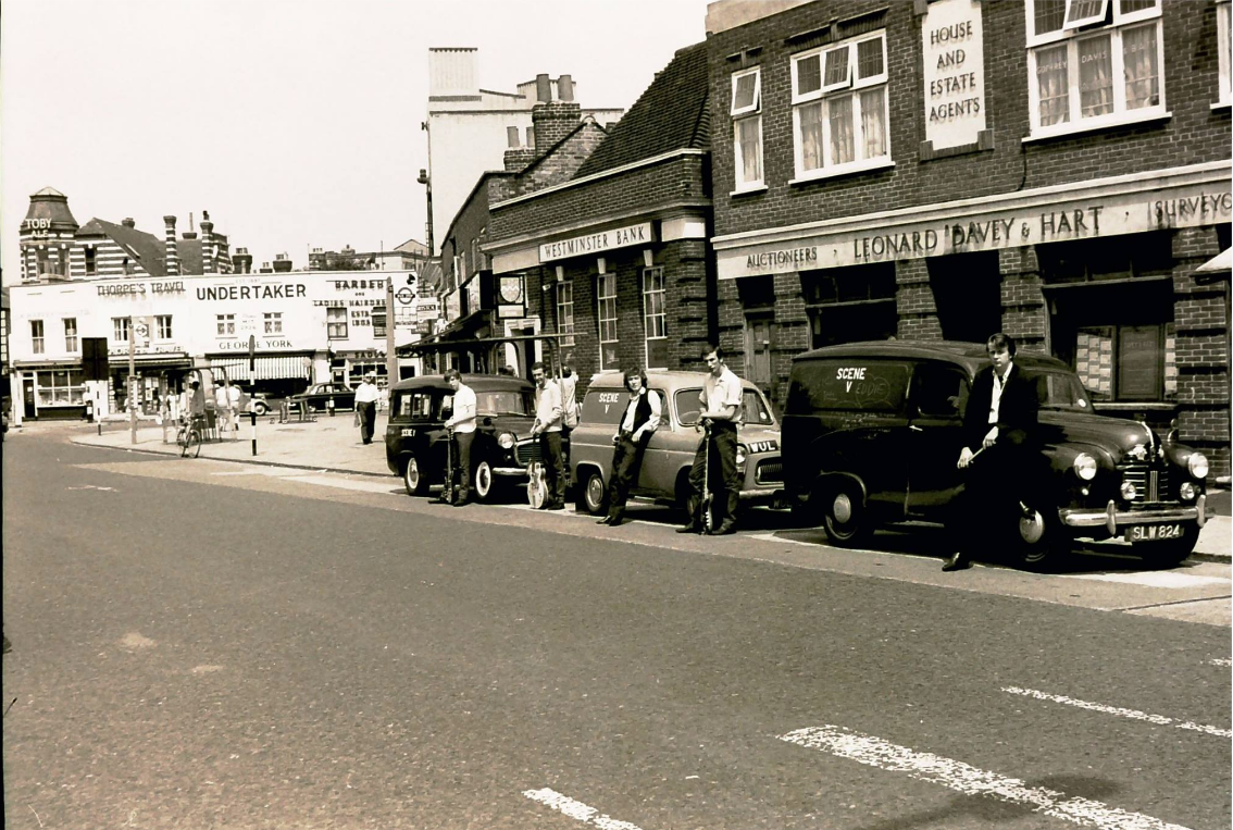 ‘Scene V’ was a beat music group in the early 1960s with, from Mitcham, drummer Stuart Hall from Birch Walk, Colin Taylor, Brenley Close and Steve Brown, Woodstock Way. They had all met at Lonesome Primary School, and afterwards had gone to Rowan Road School.