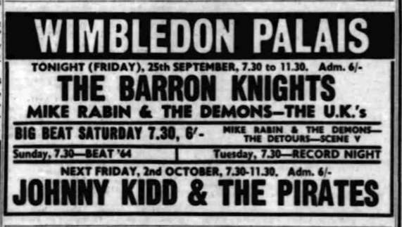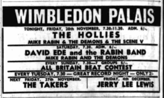 The band also appeared at the Wimbledon Palais on the Big Beat Saturday of 26th September, and on Friday 20th November 1964.