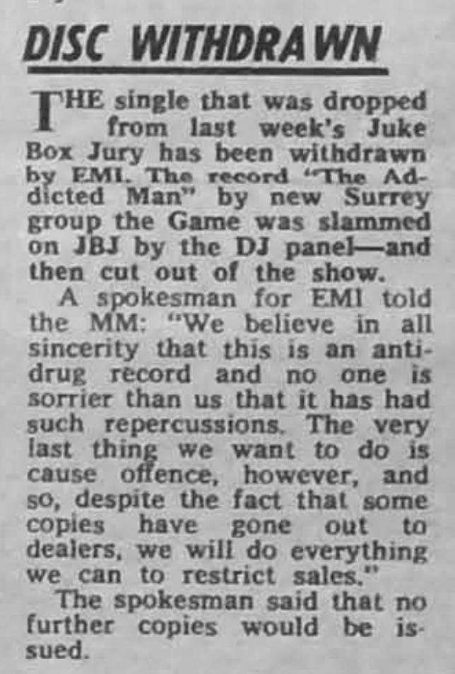 A spokesman for E.M.I. said: “We believe in all sincerity that ‘Addicted Man’ is an anti-drug record. No one could be sorrier than we are that it has caused such tremendous repercussions.