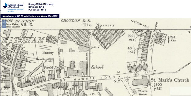 The 1911 street directory shows two lines of houses both called St Mark’s Villas. The first is a terrace of 4 houses to the west of the school, and the second a group of 8 houses as 4 semi-detached houses, numbered from 1 to 8 from the corner with Lansdell Road. Below are the occupants from this directory, as described from London Road towards Eastfields: