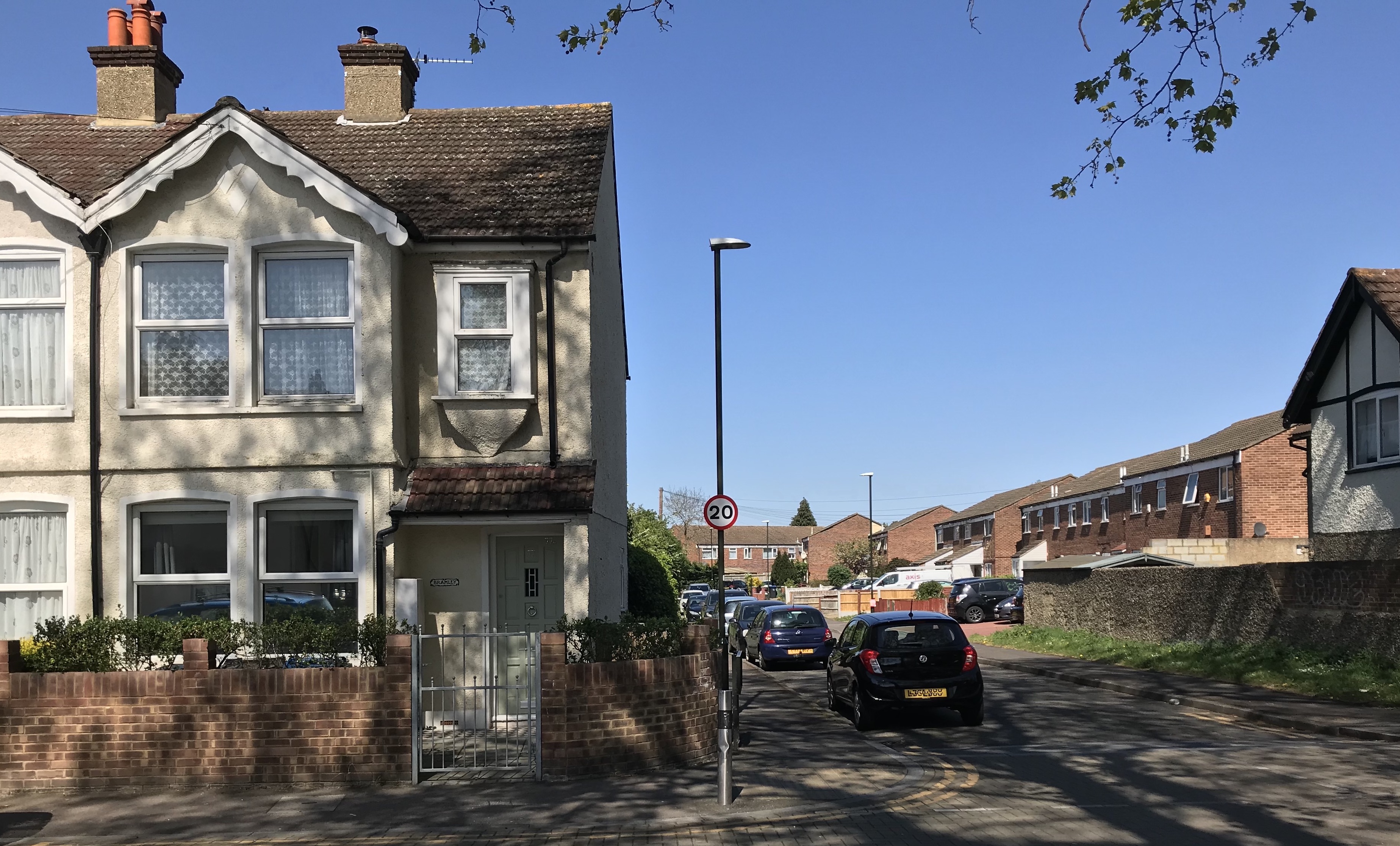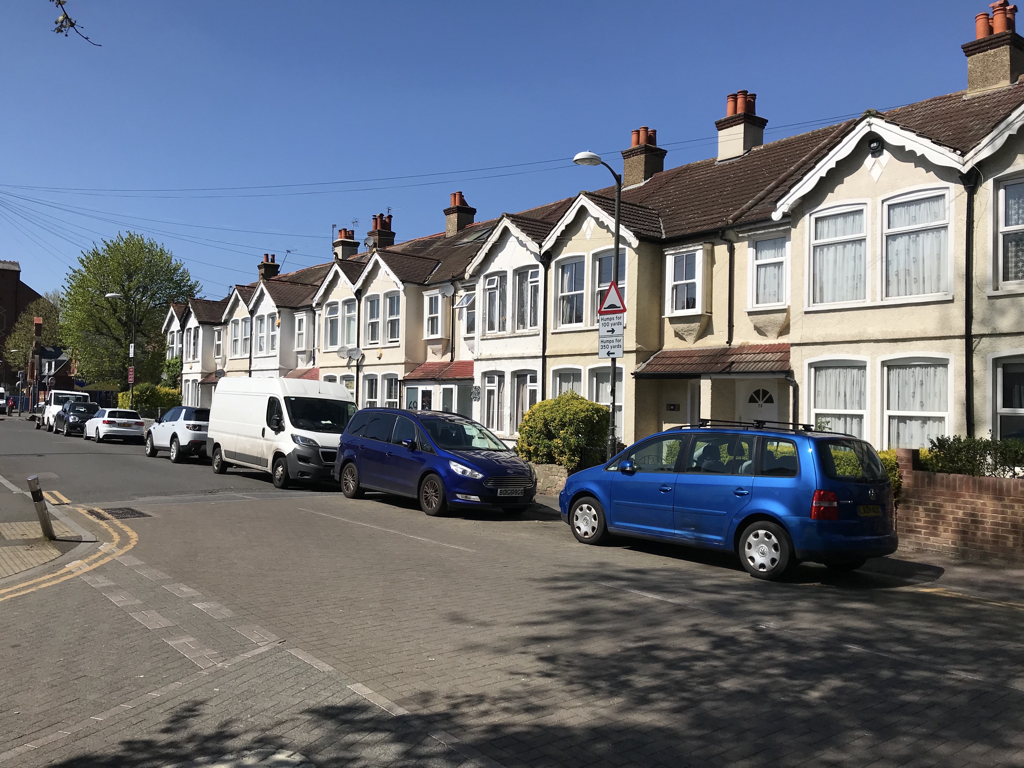 Numbers 59 to 77 st Marks Road, from the corner with Armfield Crescent on the left to Bedfont Close on the right (out of shot). Photo taken Sunday 19th April 2020.