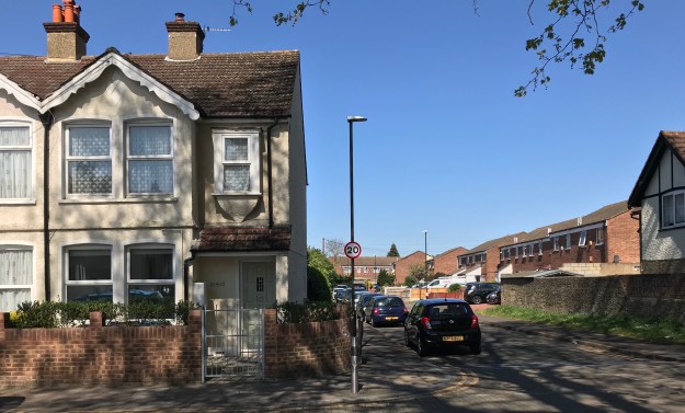 Entrance to Bedfont Close from St Marks Road. On the left, the house name Bramley is shown by the front door of no. 77. Photo taken Sunday 19th April 2020.