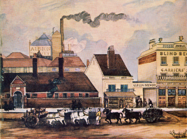 The off licence was tied to the Mann, Crossman and Paulin brewery, as can be seen in these photos. This brewery also supplied the Albion pub further up Church Road. The company’s brewery in Whitechapel was called the Albion Brewery, as seen in this 1852 painting: