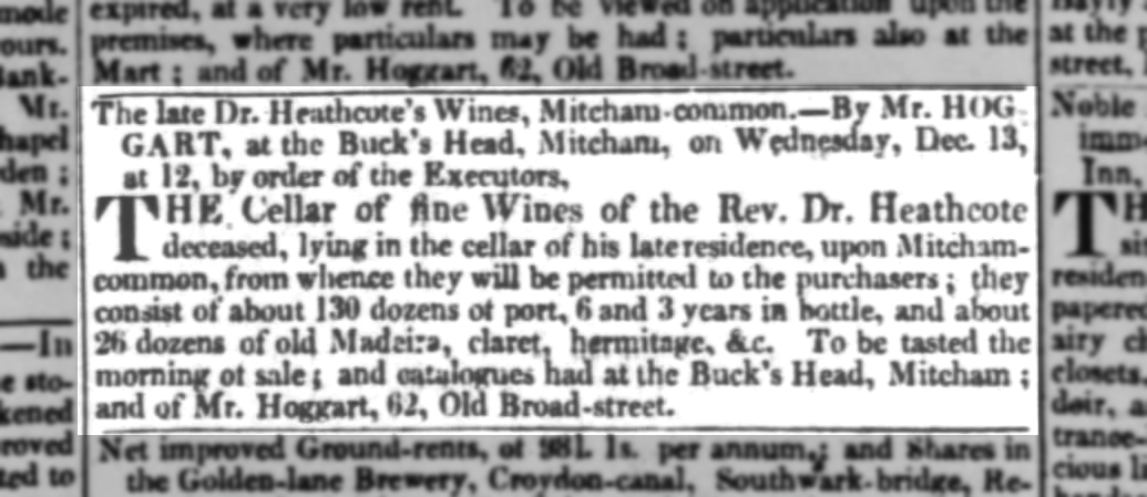 – May be viewed ten days preceding the sale, when particulars may be had at the Buck’s Head, Mitcham; the King’s Head and White Hart Inns, Lower Mitcham; at Garraway’s; and of Mr. Burrell, Throgmorton-street.