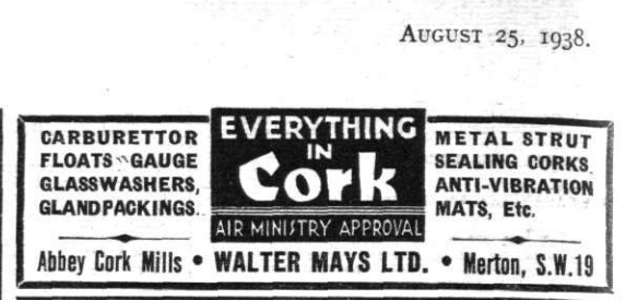 WALTER MAYS, LTD., Abbey Cork Mills, London, S.W.19 (Liberty 3764).—” Everything in cork “; carburettor and oil indicator floats, gauge glass washers, gland packings, strut sealing corks, anti-vibration mats, composition cork jointing to D.T.D.219A, laminated and plain.