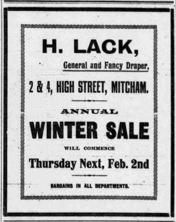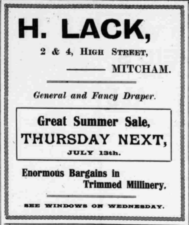A link with the old village of Mitcham was severed this week by the death of Mrs. Hannah Lack, who was in business as a draper in London-road for fifty years.