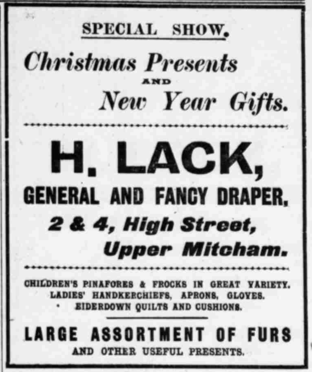 No Mitcham resident was held in greater esteem than Mrs. Lack. She came to the village, as it then was, 67 years ago and lived in the same house and conducted the same business in the High-street section of London-road, near the Fair Green, until she retired during the war. She was the widow of Mr. George Albert Lack, who died in 1878.