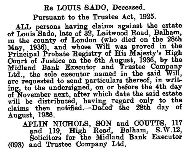 It was Alec’s father Louis who started cutting hair here, possibly between 1925 and 1930, as he is listed in the 1930 commercial directory. Louis died 1936, as shown in this London Gazette entry: