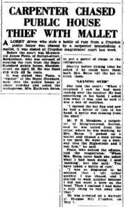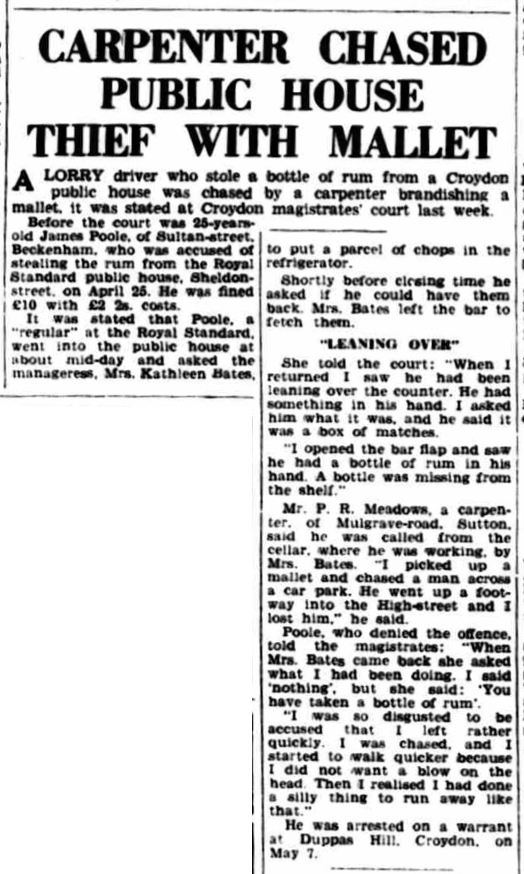 New ‘mine hosts’ for Croydon MAKING their first venture in the licensed trade are Mr. and Mrs. George E. Harvey, who have taken over the Royal Standard Inn, at the corner of Wandle-road and Sheldon-street, Croydon. For 20 years, Mr. Harvey was a partner In the firm of G. Harvey and Son, furniture Lower Addiscombe-road, Croydon. As well as running the Inn, he will continue as manager of the furniture removals section of Turner’s Transport. Ltd., Croydon. He is a keen angler. New landlord of the Gun Tavern, Church Street, Croydon, is Mr. James Crawford Patterson, who succeeds Mr. Eric Evans. Mr. Sydney (Nick) Carter, formerly or the Bulls Head, Laud-street, Croydon, took over the Licence of the Cambridge Hotel, Upper Norwood, on Wednesday.