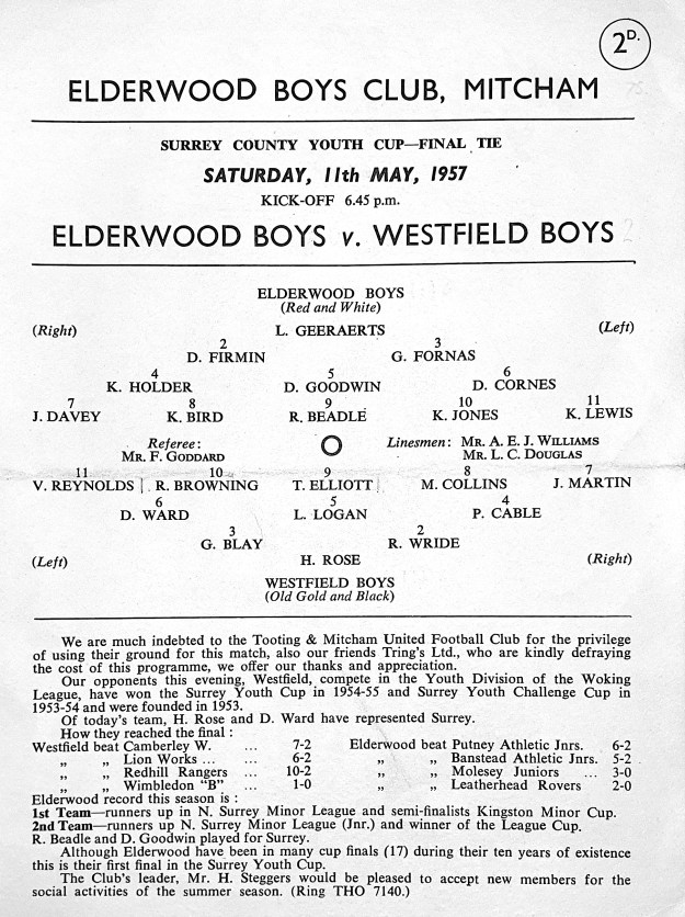 The following year, with Kenny now 18 years old, he was back at Sandy Lane with Elderwood, this time for the final of the Surrey County Youth Cup against Westfield Boys on 11th May 1957.
