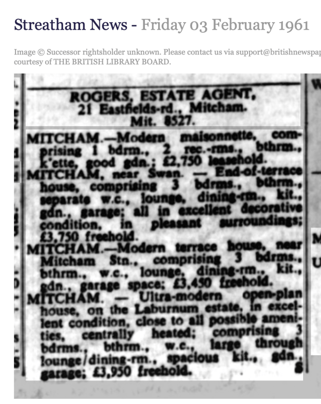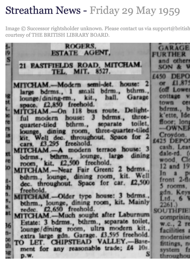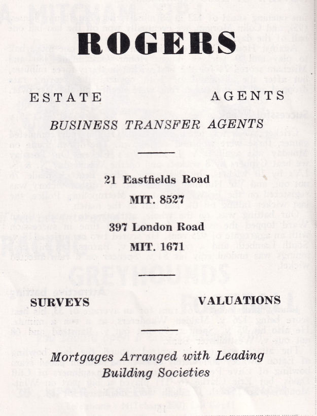 The Stadium Estate development Tony Rogers referred to, was on the site of the former Mitcham Stadium, which was called the Laburnum Park Estate, although in this 1959 ad it is simply called the Laburnum Estate. This isn’t to be confused with the Laburnum Court estate as that was council housing.