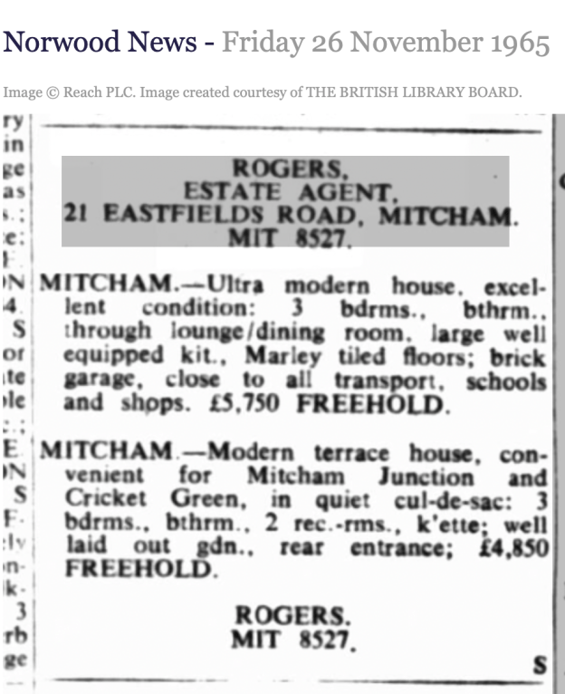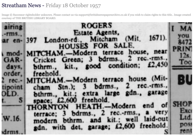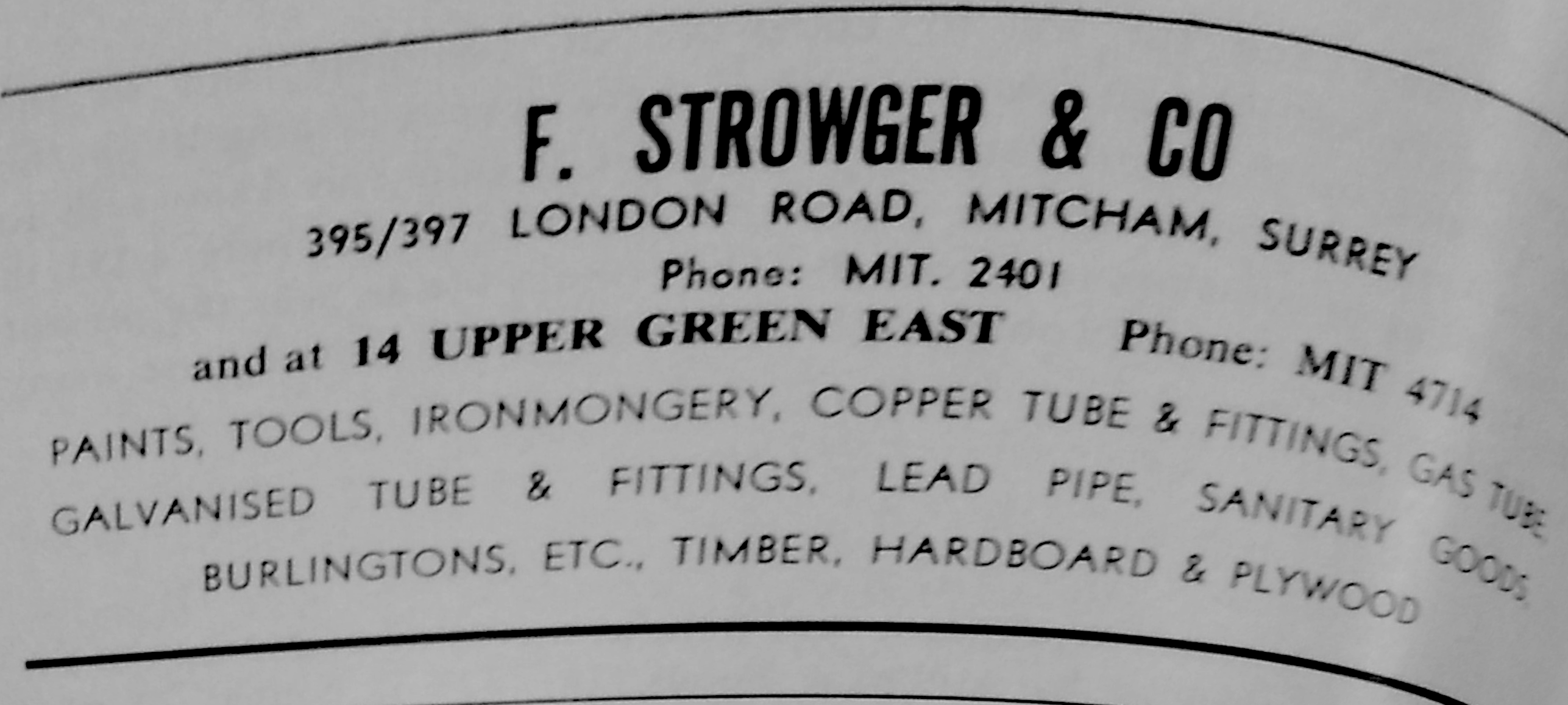 The Mitcham Chamber of Commerce Yearbook for 1967 shows an ad for F. Strowger with the address 395/397 London Road, which suggest that Strowger’s bought the Rogers estate agents office at no. 397 between 1961 and 1967.