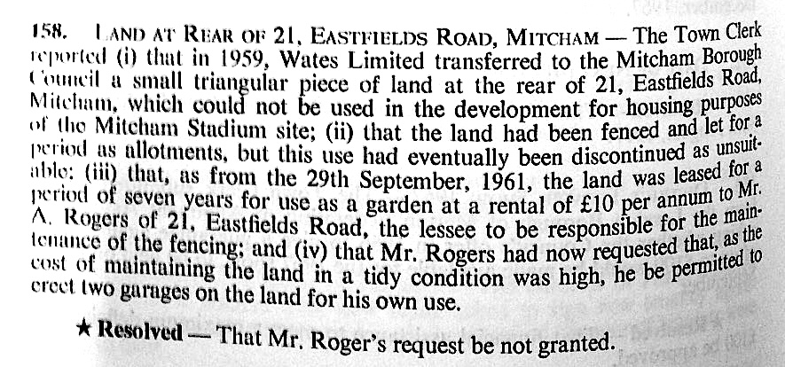 Eastfields Road, Mitcham. – Land at rear of No. 21 – The Town Clerk reported that Mr Rogers, who leased from the Council and maintained as a garden an area of land at the rear of No. 21, Eastfields Road, Mitcham, has given notice terminating his lease.