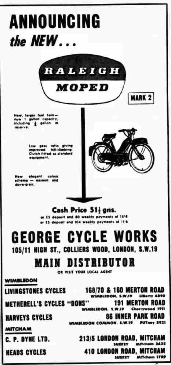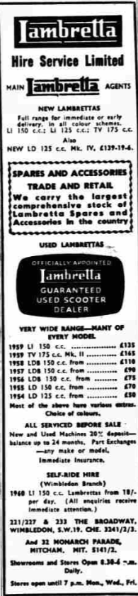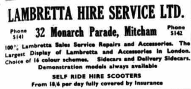 Lambretta Hire Service Ltd. was at 32 Monarch Parade, London Road. Possibly mid 1950s to 1960s. A 1960 ad, see below, said there was a branch at 221/227 and 233 The Broadway, Wimbledon.