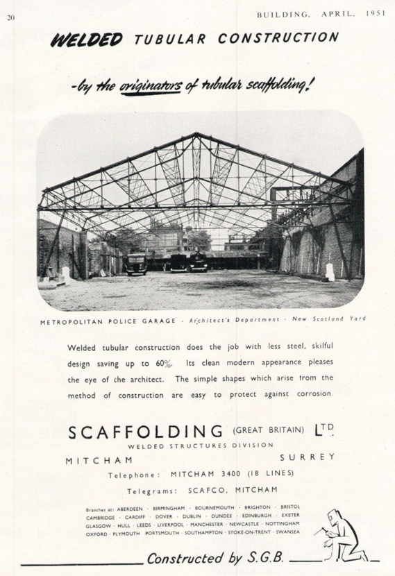 In an ad from Building magazine in 1951, the head office is shown as Mitcham, with telegrams to Scafco, Mitcham
