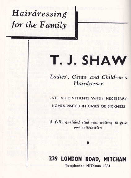 Family hairdressers, run by Tom and Lily SHAW, that was at 239 London Road, opposite Raleigh Gardens, from 1952 to 1977.